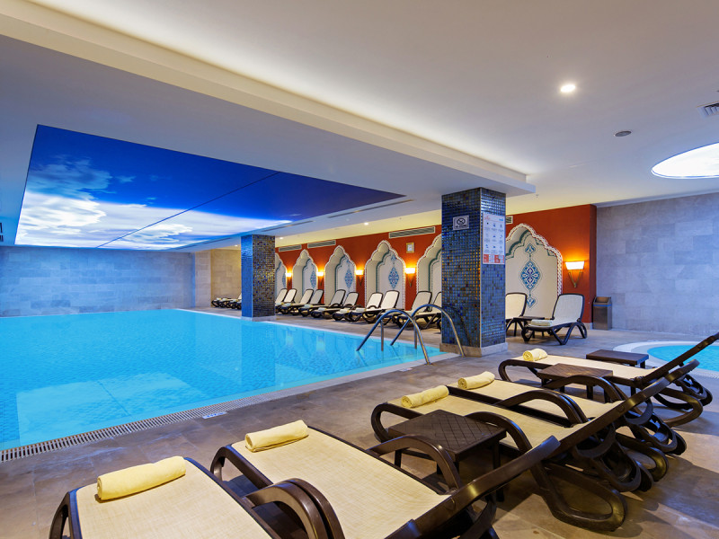 • Liegestühle • Hallenbad • Außenpool • Sonnenschirme • Poolbar • Sonnenterrasse • Badetücher • Wasserrutsche • Pool