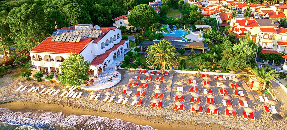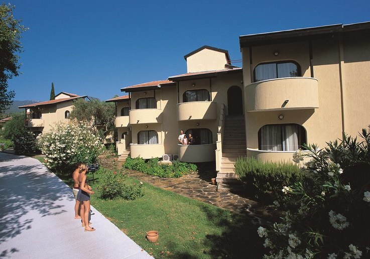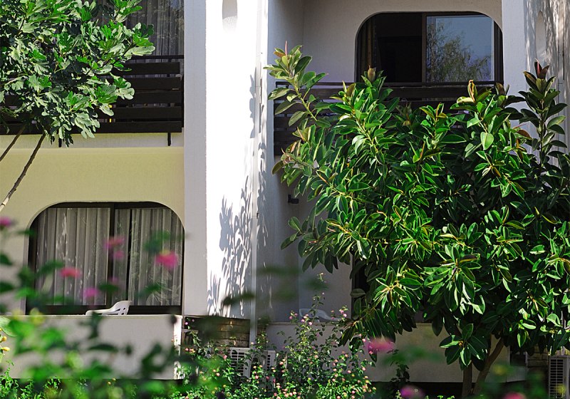 Die Anlage umfasst 70 Zimmer in fünf Gebäuden mit zwei bis drei Etagen, verbunden durch Gartenwege und Sonnenterrassen. Im Zentrum liegen Süßwasserpool, integriertes Kinderbecken und die Kinderrutsche. Am Pool und am Strand nutzt Ihr Liegen, Sonnenschirme und Badetücher ohne Aufpreis. WLAN steht in den öffentlichen Bereichen inklusive zur Verfügung. Highlight: Kompakte Wege mit klarer Struktur rund um den Poolbereich.