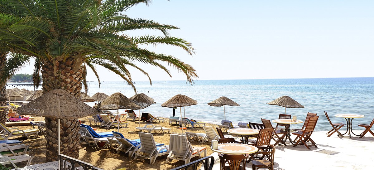 Die Lage spricht für kurze Wege: Das Haus steht direkt am Kies- und Sandstrand von Gümüldür‑Özdere. Zur Ortschaft sind es etwa 1 km, das Zentrum von Kusadasi liegt rund 40 km entfernt. Vor dem Hotel halten Minibusse, so erreicht Ihr umliegende Ziele ohne eigenes Auto. Der Strand ist laut Daten 100 m entfernt, praktisch vor Eurer Liege mit bereitgestellten Badetüchern. Highlight: Direkte Strandlage mit Minibus‑Anbindung und kurzer Distanz zur Ortschaft.