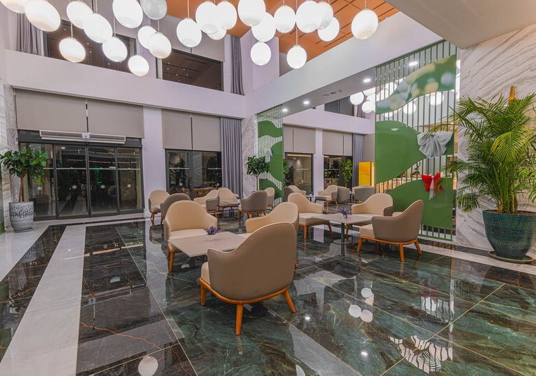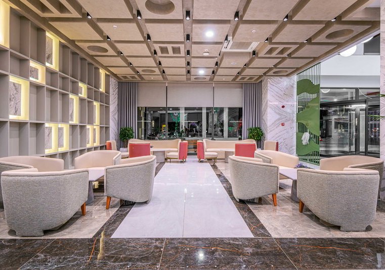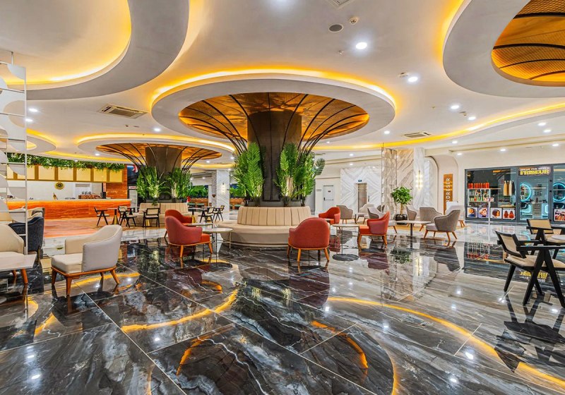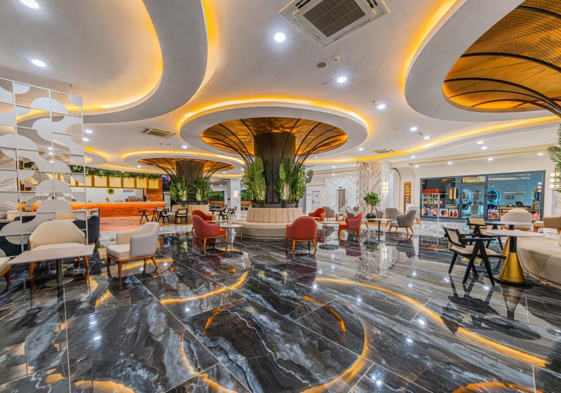 Die Anlage öffnet seit 2024 mit 5‑Sterne‑Kategorie und 350 Zimmern. Ihr betretet eine großzügige Empfangshalle mit 24‑h‑Rezeption; Aufzüge, Shops, Friseur, Souvenir‑Shop und Supermarkt bündeln Services effizient. WiFi steht in der gesamten Anlage und in den Zimmern stabil bereit.