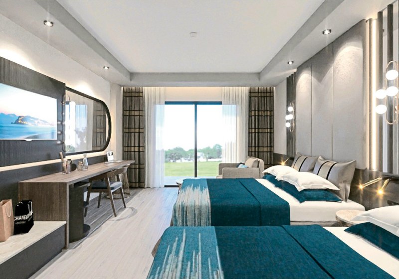 Draußen öffnen sich große Poolflächen mit Hauptpool, Ruhepool und Kinderbecken, flankiert von Sonnenterrassen. Der Aquapark mit 11 Rutschen und 2 Babyrutschen liefert Tempo, während am Pool und Strand Liegen, Auflagen, Sonnenschirme und Badetuchservice bereitstehen. Tennis-Hartplatz, Multifunktionsplatz, Tischtennis, Beachvolleyball und ein Fitnessraum runden die Infrastruktur ab. Highlight: Aquapark-Vielfalt – viele Rutschen, klar abgegrenzte Bereiche für alle Altersstufen.