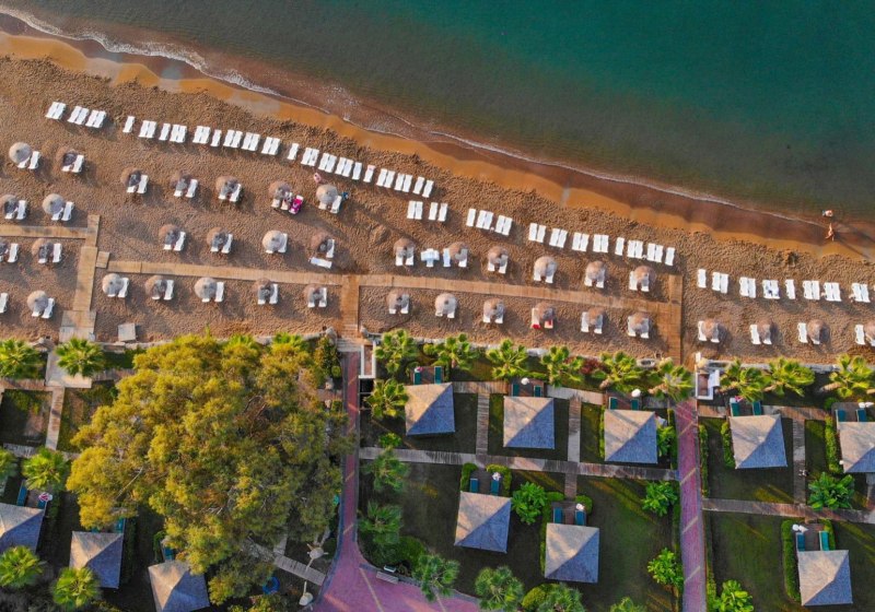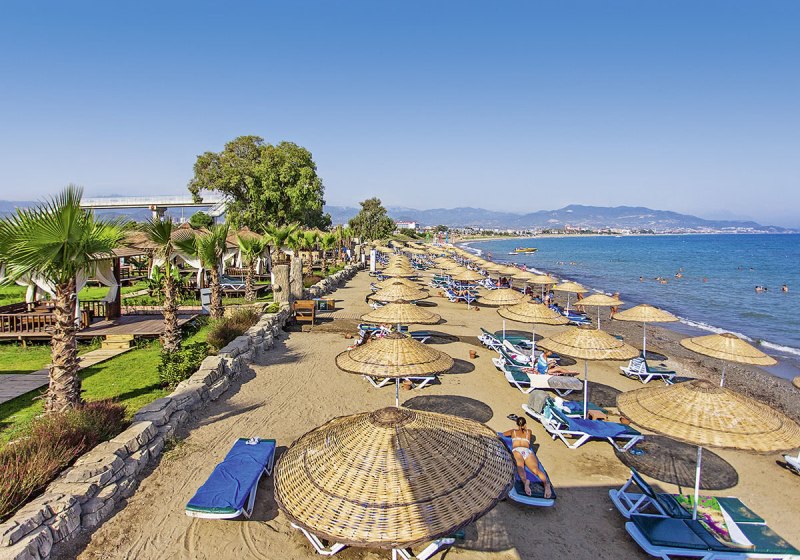 Ihr wohnt in Türkler, nur durch die Küstenstraße vom Sand-/Kiesstrand getrennt; eine Unterführung führt bequem und sicher hinüber. Alanya liegt rund 18 Kilometer entfernt und bietet eine größere Auswahl an Ausflugszielen und urbanem Leben. Direkt am Strand erwarten Euch Liegestühle, Sonnenschirme und eine Strandbar. In der Anlage wechselt die Stimmung zwischen Pooltrubel und geschützteren Terrassen. Highlight: Unterführung am Hotel verbindet rasch die Pools mit Strand und Strandbar.