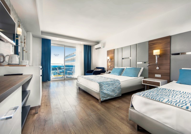 Ihr wohnt in Zimmern mit Dusche, WC, Föhn, Sat-TV, Klimaanlage, Safe, Laminatboden, Balkon und Minibar. Viele Kategorien bieten zusätzliche Optionen wie Kaffee-/Teezubereiter, Internetzugang und schallisolierte Ruhe. Fünf rollstuhlgerechte Zimmer sind vorhanden, ebenso Nichtraucher- und Raucherzimmer. Meerblick ist in ausgewählten Einheiten buchbar. Highlight: Swim-up-Zimmer bieten direkten Poolzugang in separaten Gebäuden.