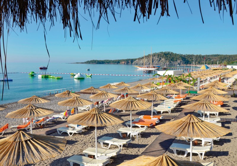 Ihr residiert in Çamyuva, direkt am privaten Sand- und Kiesstrand. Kemer liegt etwa 7 Kilometer entfernt, der Flughafen Antalya rund 70 Kilometer. Die Strandbereiche sind mit Liegestühlen und Sonnenschirmen ausgestattet, eine Strandbar bedient Euch täglich von 10 bis 18 Uhr. Gazebos ergänzen das Setup am Wasser.
