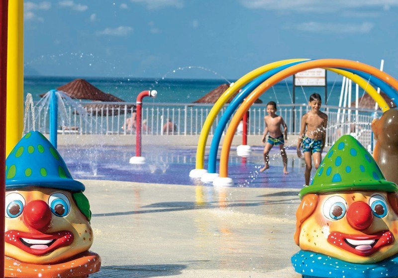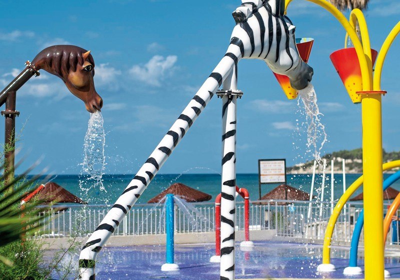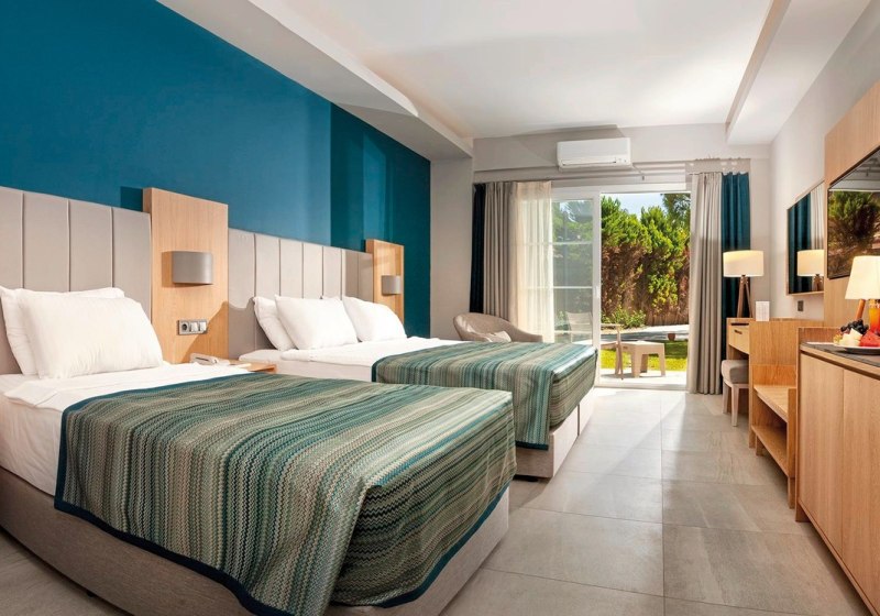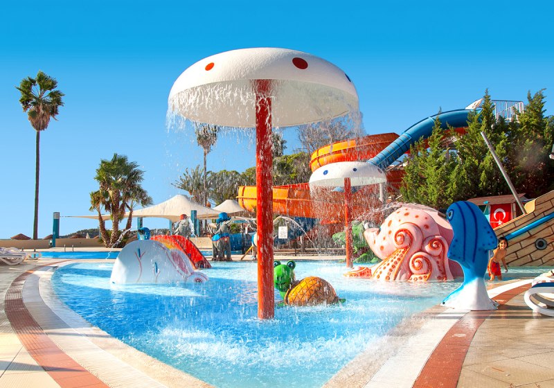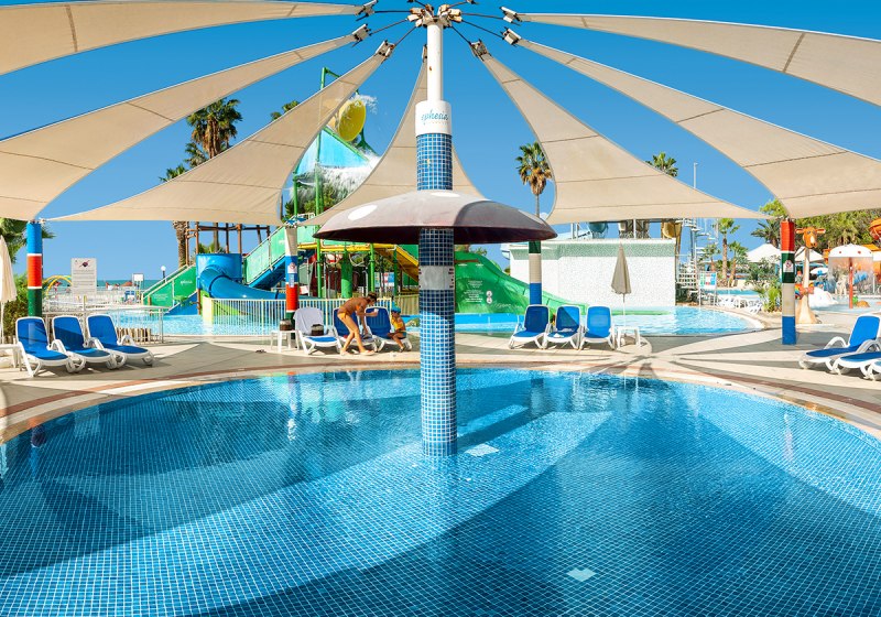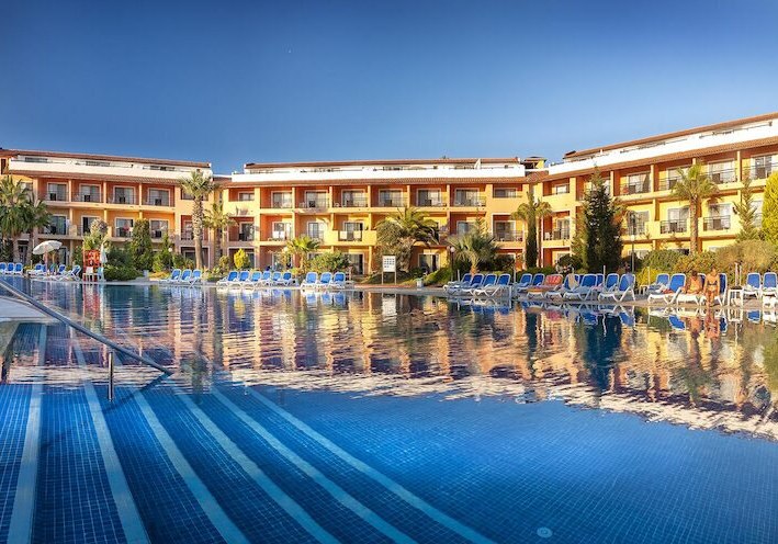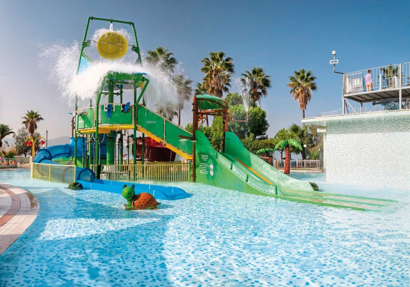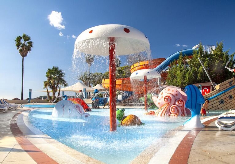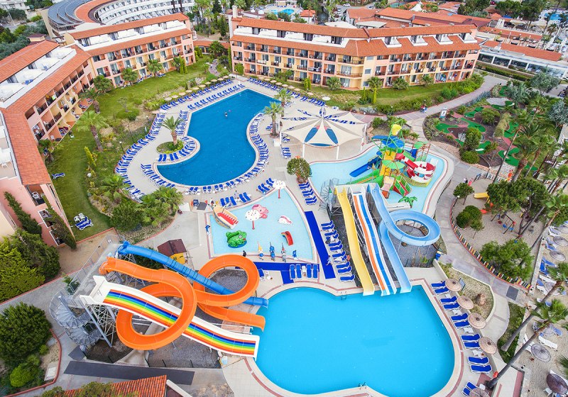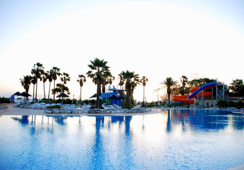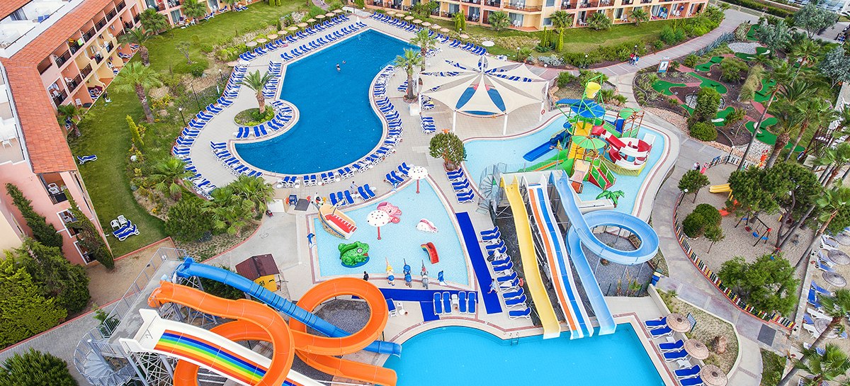 Das Resort verteilt sich über einen weitläufigen Garten mit vier Swimmingpools, Sonnenterrassen und Liegewiesen. Der Aquapark mit sechs Wasserrutschen setzt klare Akzente für Wasseraction. Im Empfangsbereich mit Rezeption und Lobbybar kommt Ihr an, WLAN ist im Bereich des Einkaufszentrums inklusive.