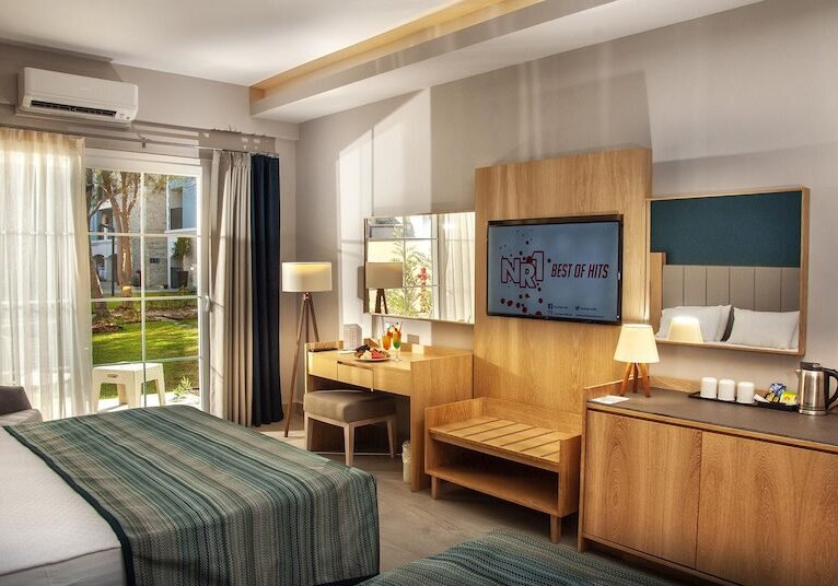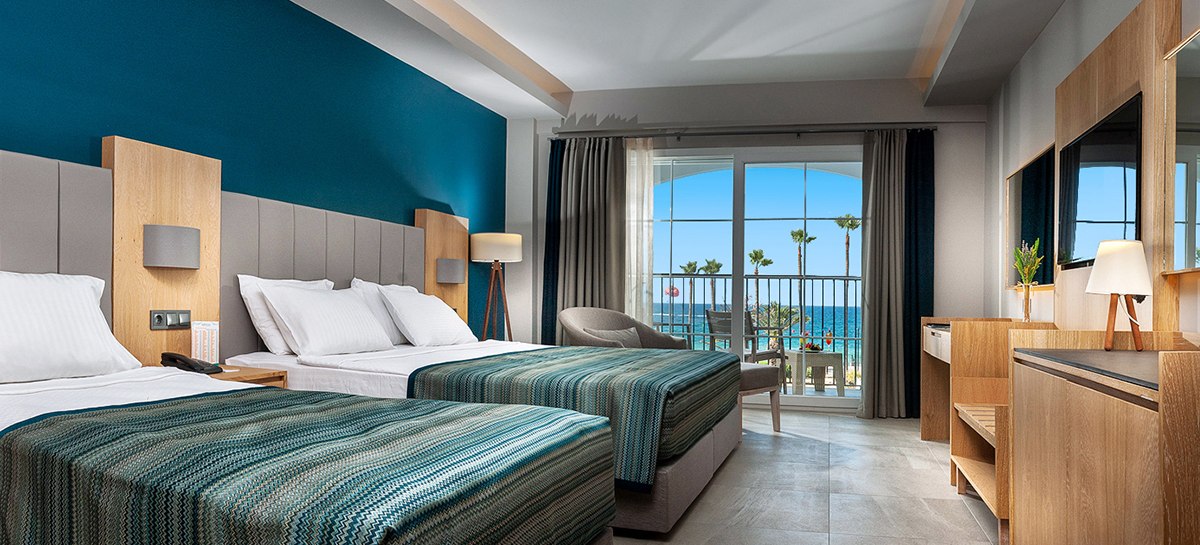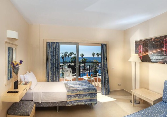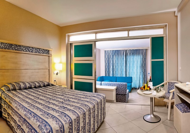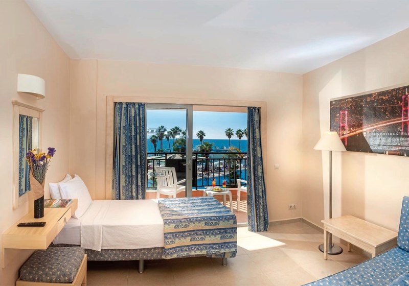 Ihr wohnt in klimatisierten Zimmern mit Dusche/WC, Föhn, Direktwahl‑Telefon, LCD‑Sat‑TV, WLAN, Minibar, Safe, Wasserkocher und Fliesenboden. Einige Zimmer sind mit Balkon und Meerblick buchbar. Für mehr Raum bieten Familienzimmer ein durch Schiebetür getrenntes Schlafzimmer.