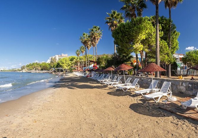 Die Lage ist direkt am Sand‑/Kiesstrand, was Euch kurze Wege vom Zimmer an die Küste schenkt. Bis Kusadasi sind es etwa 6 km; Einkauf und Unterhaltung liegen in der Nähe. Mit der Beachbar bleibt Ihr auch am Wasser bestens versorgt. So verbindet Ihr Strandzeit mit schnellen Abstechern zu lokalen Angeboten.