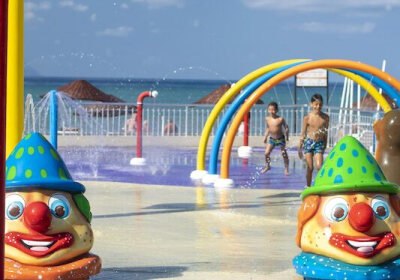 Mehrere Shops und eine Game‑Hall erweitern die öffentlichen Bereiche, dazu Miniclub‑Zonen und separate Kinderbecken. Am Pool und Strand nutzt Ihr Liegen, Auflagen, Sonnenschirme und Badetücher inklusive. Highlight: Aquapark mit sechs Rutschen schafft einen markanten Freizeitfokus im Herzen der Anlage.