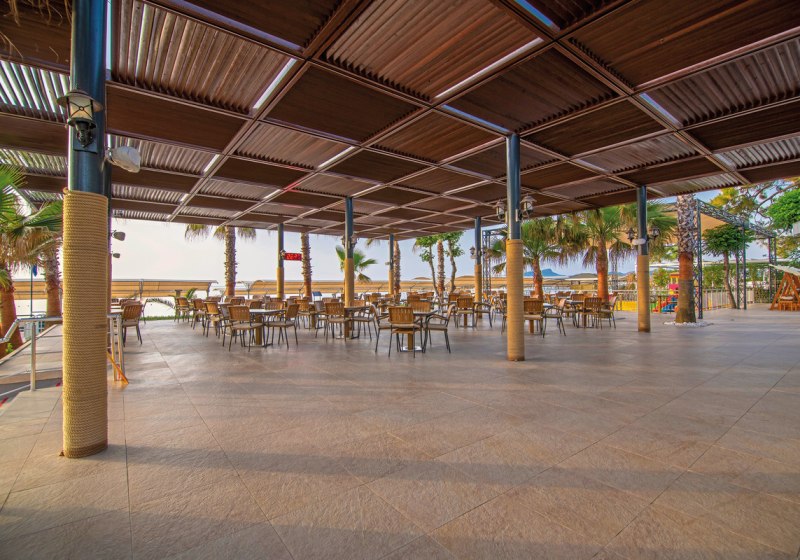 Die Atmosphäre ist freundlich und zweckmäßig: Ihr gleitet vom Frühstück in der Terrasse des Hauptrestaurants zum Strand, nur durch eine kleine Straße getrennt, und später zur Beachbar oder zur Pool-Snackbar. WLAN in der Lobby hält Euch in Verbindung, während Liegen, Auflagen, Sonnenschirme und Badetücher am Pool und Strand Komfort sichern. Wer Abwechslung sucht, wechselt in den Garten- und Spielbereich oder schaut im Miniclub vorbei, bevor der Abend an Bars und in der hauseigenen Disco ausklingt.