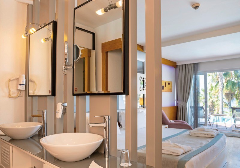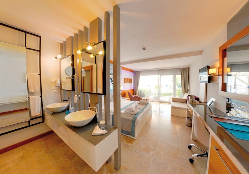 Ihr wohnt in Zimmern mit Dusche/WC, Föhn, individueller Klimaanlage, Minibar, Safe, Telefon und LCD-Sat-TV; Balkon oder Terrasse gehört dazu. Meerblick oder seitlicher Meerblick ist buchbar. Das Design folgt einem klaren Komfortverständnis, funktional und aufgeräumt. Highlight: Zimmer mit Meerblick-Optionen setzen den Fokus aufs Wasser.