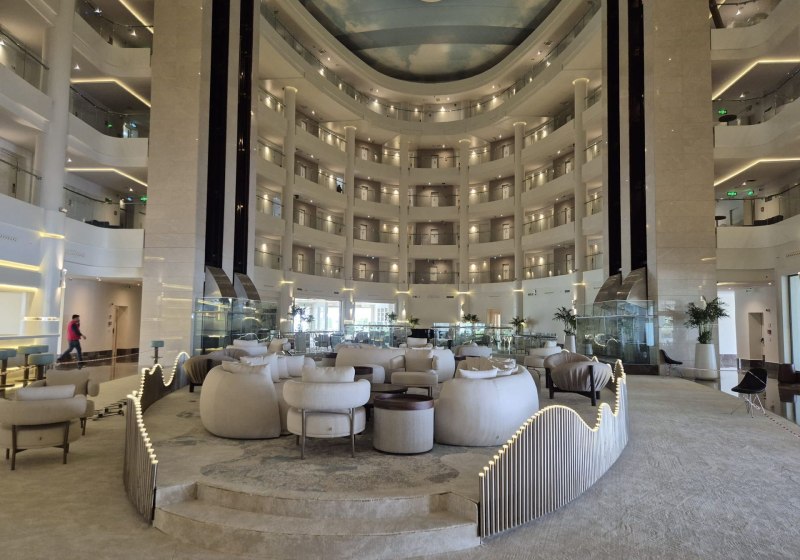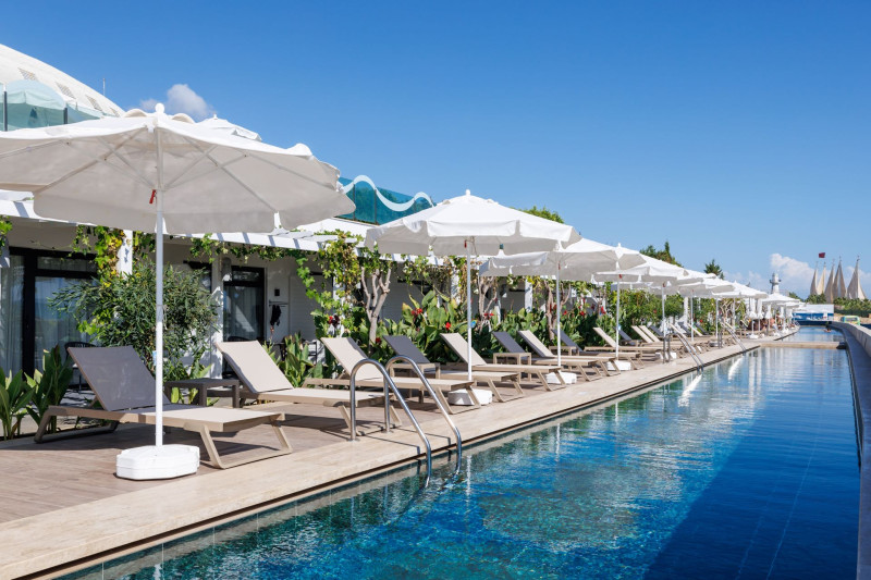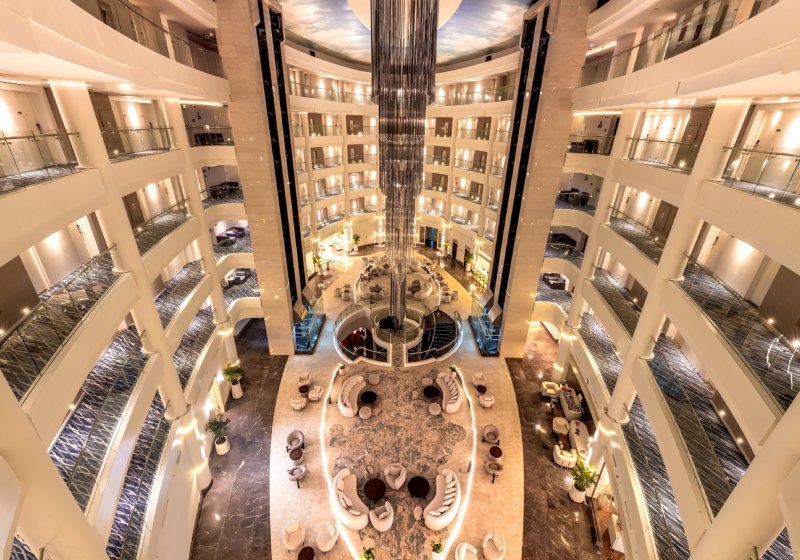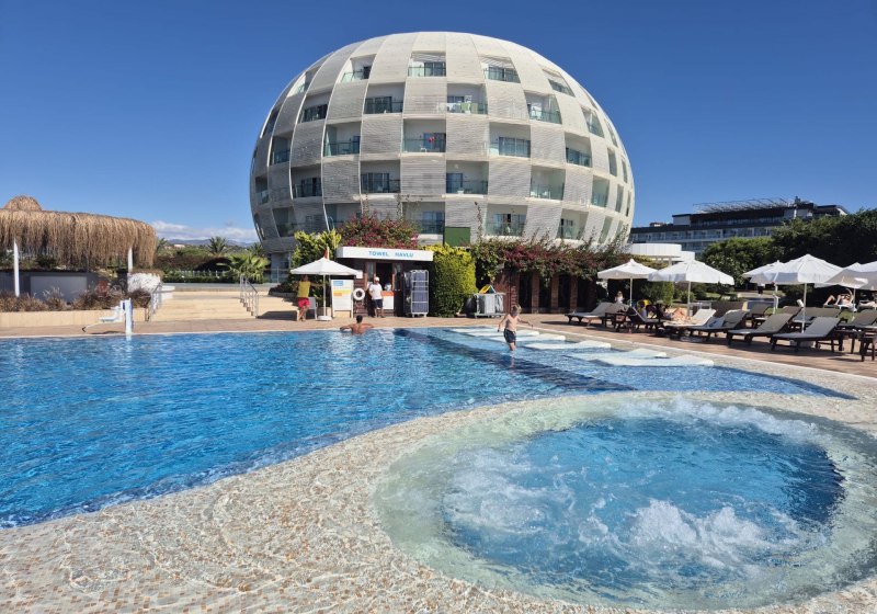 Die öffentlichen Bereiche sind funktional organisiert: Lobby mit Rezeption, Lifte und WLAN schaffen klare Abläufe. Ein Minimarkt und ein Friseur liegen praktisch im Ensemble. Draußen verteilen sich Sonnenterrassen, ein großer Pool sowie ein separater Bereich mit drei Wasserrutschen für den dynamischen Teil des Tages.