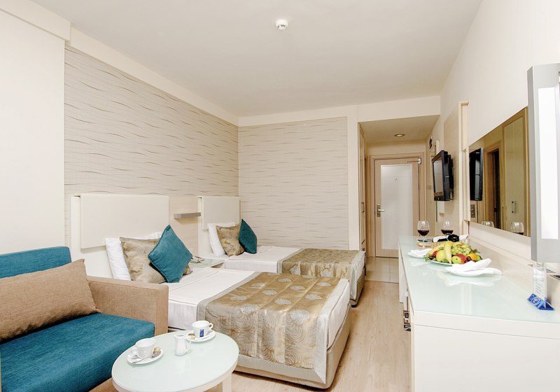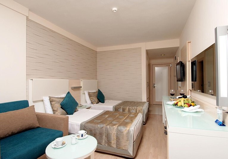 Für den Komfort stehen Minibar (gegen Gebühr), Kaffee‑/Teezubereiter und Mietsafe bereit. Zimmer zur Meerseite sind buchbar – ideal, wenn Ihr den Standort am Kleopatrastrand auch im Ausblick erleben wollt. Babybetten erhaltet Ihr auf Anfrage, rollstuhlgerechte Zimmer sind ebenfalls auf Anfrage verfügbar.