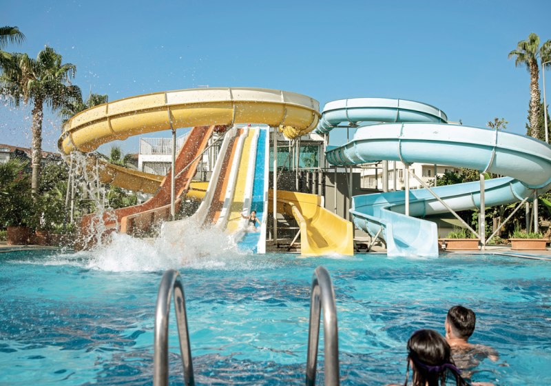 • Liegestühle • Hallenbad • Außenpool • Sonnenschirme • Pool • Poolbar • Sonnenterrasse • Badetücher • Wasserrutsche • Wasserpark