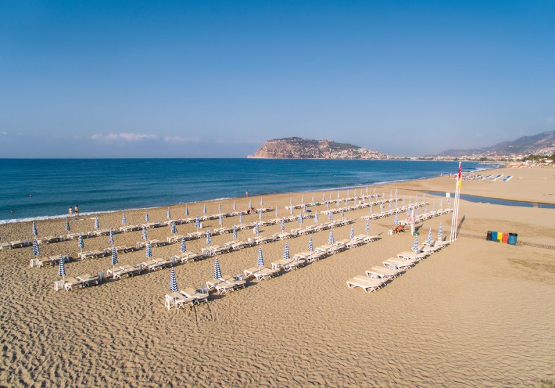 Das Resort liegt in Oba, rund 3 Kilometer vom Zentrum Alanyas entfernt. Zum Sand-/Kiesstrand gelangt Ihr nach etwa 50 Metern bequem durch eine Unterführung. Vor Ort unterstützen Euch Liegen und Sonnenschirme am Strand ebenso wie am Pool, eine Strandbar ergänzt den kurzen Weg ans Wasser. Der Flughafen Gazipaşa ist mit circa 39 Kilometern Entfernung erreichbar, was die An- und Abreise strukturiert. Die Lage verbindet Nähe und Ruhe: Ihr erreicht Alanyas Zentrum für Ausflüge, Shopping oder Hafenmomente, bleibt aber im Tagesablauf unabhängig. Wer flexibel bleiben möchte, nutzt Mietwagenverleih, Transferservice oder den hoteleigenen Shuttleservice. Die Wege im Resort sind klar: Vom Pool über Sonnenterrassen hinunter Richtung Strand. So plant Ihr Eure Tage ohne Umwege – ein Vormittag am Meer, ein Nachmittag im Aquapark, der Abend zwischen Bars und Terrasse. Die Umgebung wirkt maritim und lebhaft, ohne Euch den eigenen Rhythmus zu diktieren.