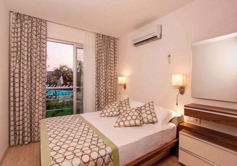 Die Zimmer im Green Garden Resort & Spa Hotel sind funktional ausgestattet und klar strukturiert. Ihr trefft auf Dusche/WC, Sat-TV beziehungsweise LCD-Sat-TV, Klimaanlage (teils individuell), Telefon und Mietsafe. Eine Minibar oder ein Mini-Kühlschrank steht bereit; je nach Zimmer ergänzt ein Wasserkocher oder Kaffeekocher. Fliesen- oder Laminatboden sorgt für eine aufgeräumte Anmutung. Viele Einheiten verfügen über einen Balkon, teils mit Tisch und Stühlen.