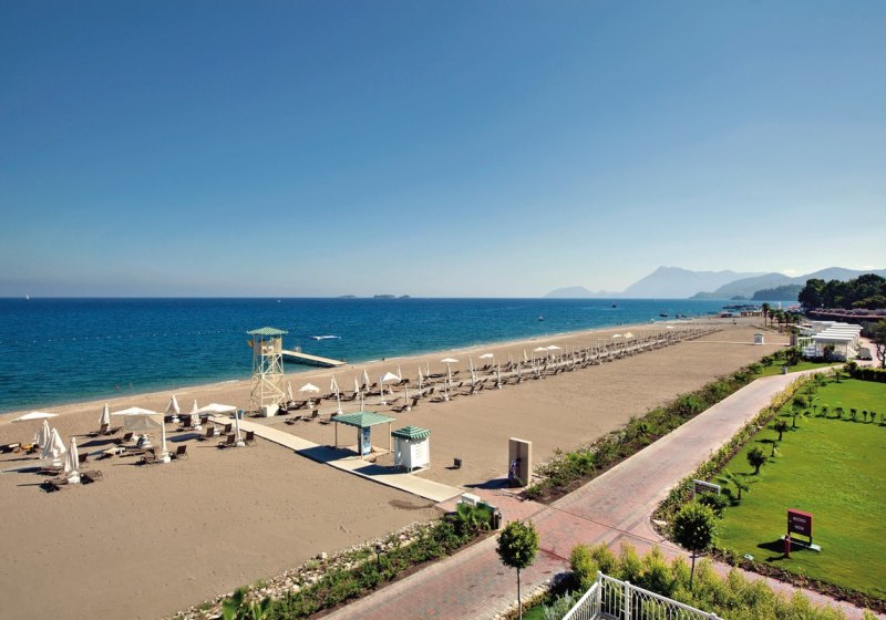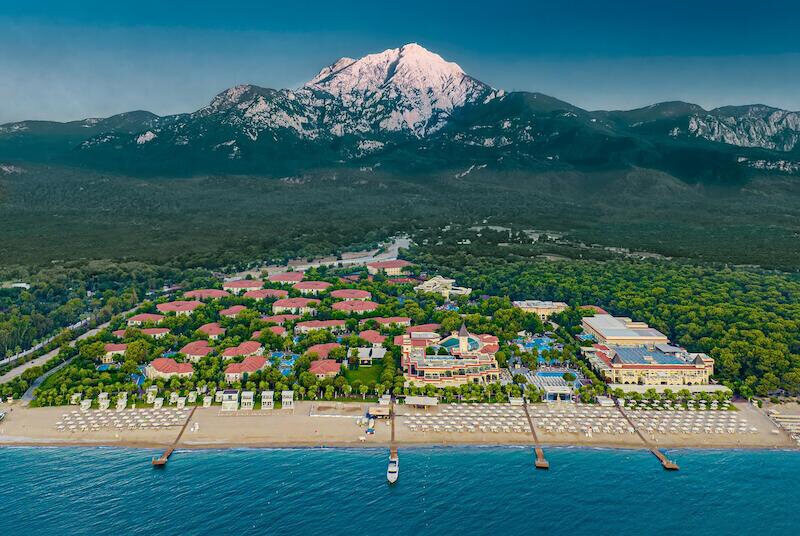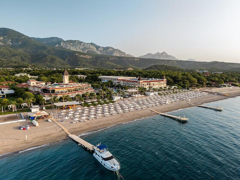 Die Lage ist direkt am hoteleigenen Sand‑/Kiesstrand bei Tekirova und eröffnet Euch den Blick auf das Taurusgebirge. Das Meer liegt 20 Meter entfernt, zum Ortszentrum und zu Einkaufsmöglichkeiten sind es rund 300 Meter. Kemer erreicht Ihr nach etwa 17 Kilometern, der Flughafen Antalya liegt ungefähr 75 Kilometer entfernt.