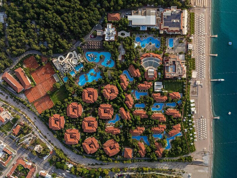 Familien findet Ihr im 3.600 m² großen Kinderclub‑Bereich und im Aquapark: 22.000 m², 26 Wasserrutschen, Kinderbereiche mit Piratenschiffen und Aktivitätspools. Sportlich bleibt Ihr im Fitness‑Center oder auf den Tennisplätzen, abends zieht es Euch ins Amphitheater und zur Open‑Air‑Diskothek. Kulinarisch führt der Weg vom Hauptrestaurant mit Terrasse zu À‑la‑carte, Snack‑Restaurant, Patisserie und mehreren Bars.
