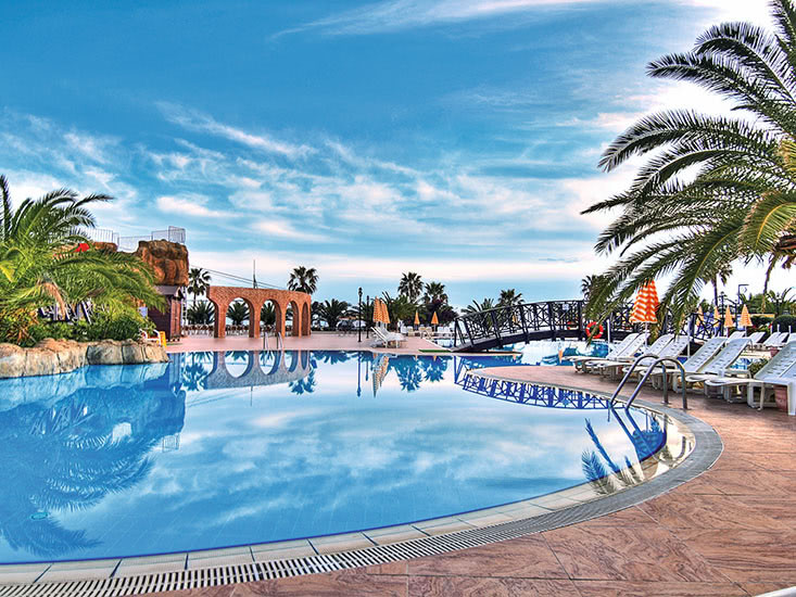 Die Anlage ist als Feriendorf mit Gartenstruktur konzipiert und bietet viele Anlaufpunkte: Rezeption, Aufenthalts- und TV-Bereiche, Shops, Souvenir- und Supermarkt, Friseur sowie ein Amphitheater. WLAN nutzt Ihr in der gesamten Anlage, vom Zimmer bis zur Terrasse. Zwei Außenpools mit Sonnenterrassen, Liegen, Auflagen und Sonnenschirmen bilden das Zentrum des Geschehens.