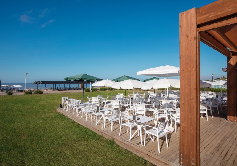 - Terrasse & Snack: Terrasse im Hauptrestaurant, Strand-Snackbar für kurze Wege.