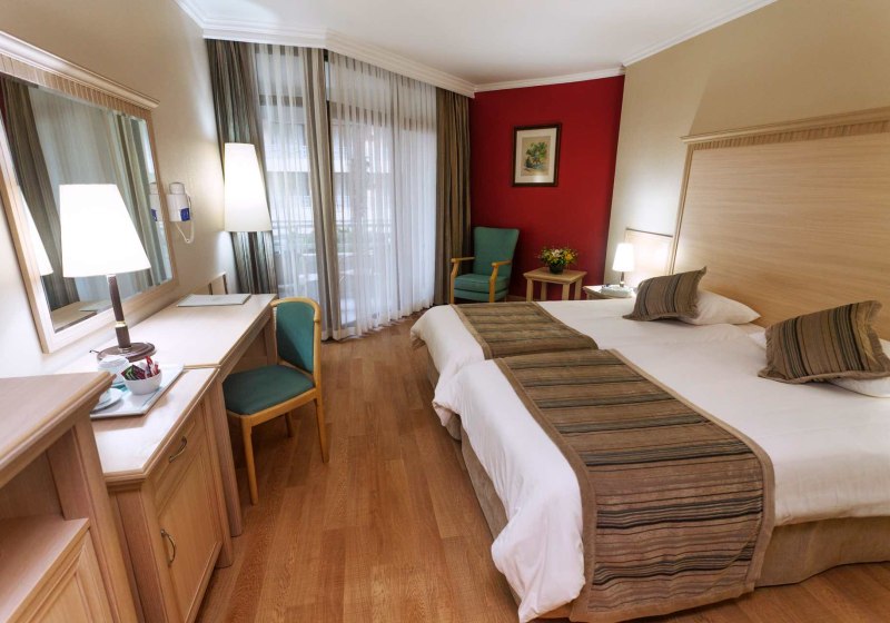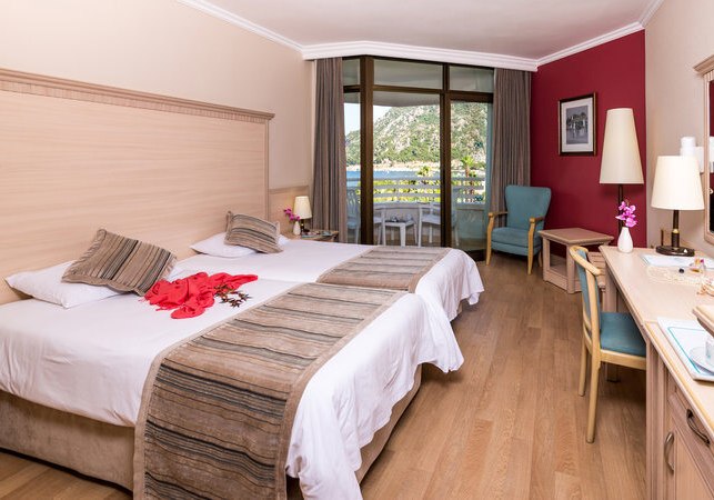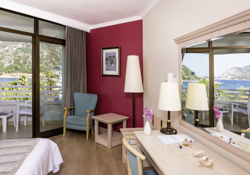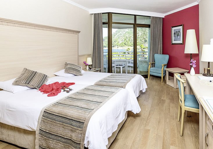 Ihr wohnt in Zimmern mit Dusche/WC, Föhn, LED-Sat-TV, Minibar, Direktwahltelefon, Tee-/Kaffee-Setup, zentraler Klimaanlage und Safe. Die meisten Einheiten verfügen über Balkon; buchbar mit Landblick oder seitlichem Meerblick. WLAN ist inklusive. Highlight: Solide Ausstattung mit klimatisierten Zimmern und Balkonvarianten.