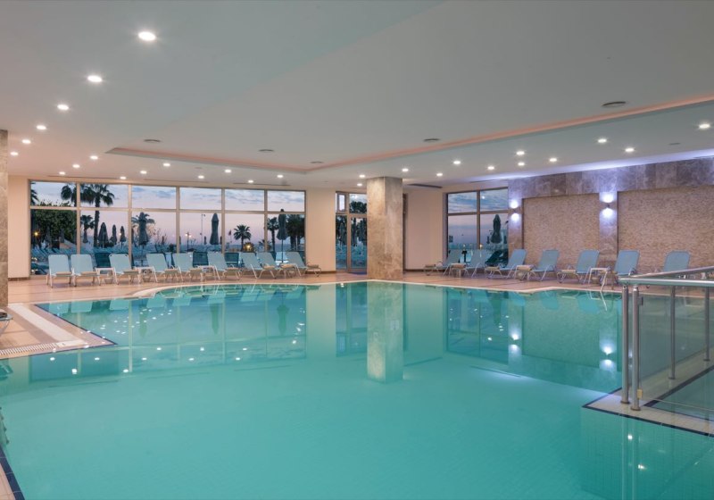 • Außenpool • Poolbar • Badetücher • Wasserrutsche • Liegestühle • Hallenbad • Sonnenschirme • Pool • Sonnenterrasse