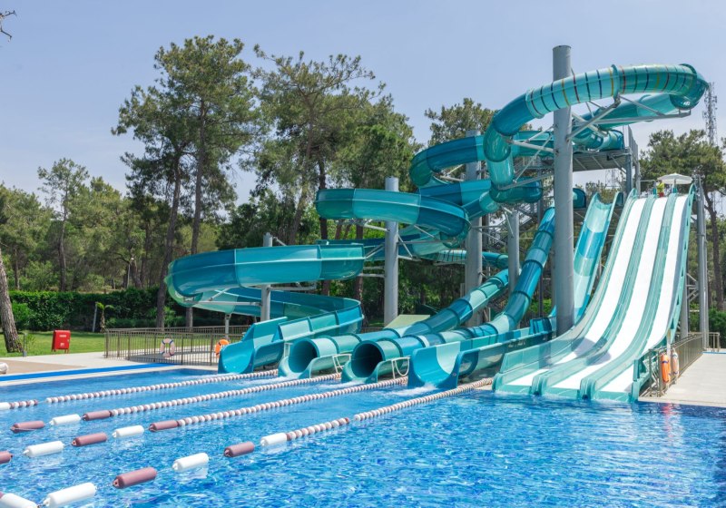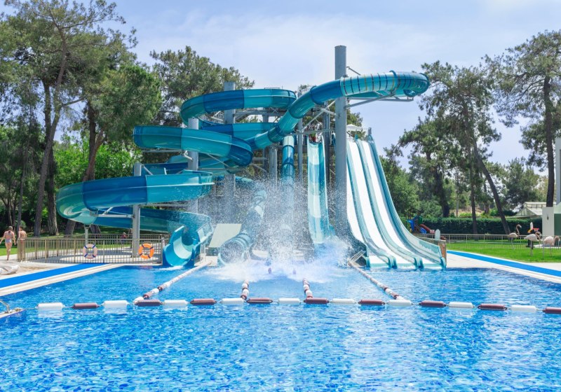 - Wasserwelten: Süßwasser-Pools, Kinderpool und Aquapark mit Rutschen im Grünen.