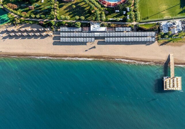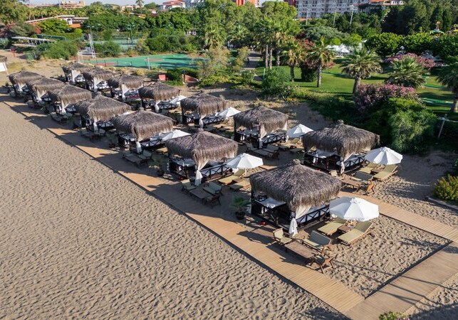Ihr wohnt direkt am Sand-/Kieselstrand von Belek, mit kurzen Wegen vom Zimmer zum Meer. Zum Flughafen sind es etwa 35 km, nach Antalya rund 40 km. Taxis stehen vor dem Hotel, Minibusse verbinden Euch mit Belek; das Stadtzentrum liegt ungefähr 1 km entfernt, ebenso eine Apotheke. Ein Busknotenpunkt bei Serik ist etwa 8 km entfernt, Golfplätze befinden sich in der Umgebung.