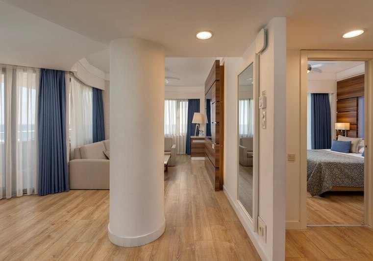 Familienzimmer bieten einen zusätzlichen Wohn-/Schlafraum mit Verbindungstür, teils zwei Badezimmer. Je nach Lage blickt Ihr auf Garten oder Pool. Verfügbare Betten reichen von Doppel- über Kingsize- bis zu Twin-Varianten, ergänzt durch Schlafsofa und Babybett auf Anfrage. Highlight: Familienfreundliche Grundrisse mit Verbindungstür und optional zwei Bädern.