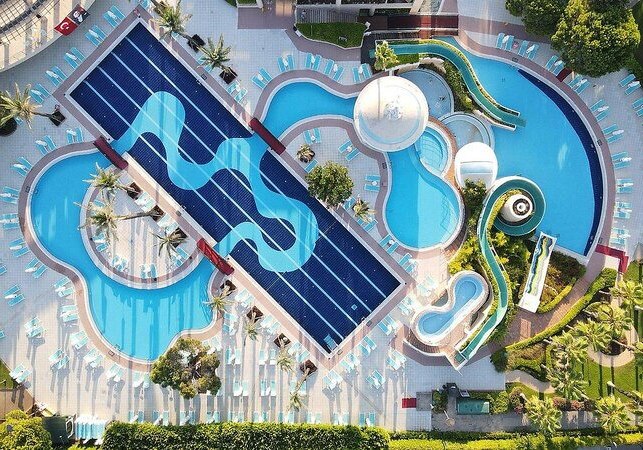 - Poolvielfalt: Vier Süßwasserpools plus Kinderbecken und Rutschen warten.