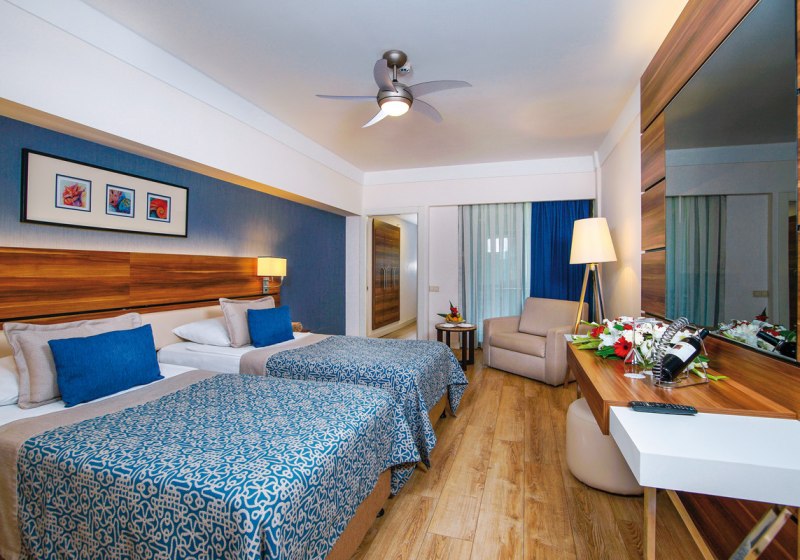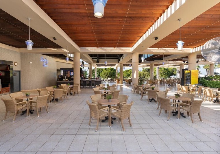 Die Anlage wirkt großzügig, mit Empfangshalle, Theatersaal und Einkaufspassage. WLAN ist in Anlage und Zimmern inklusive. Liegen, Sonnenschirme und Strandtücher stehen am Pool und Strand bereit. Vier Süßwasserpools, Kinderbecken und Wasserrutschen bilden das Herz der Außenbereiche.