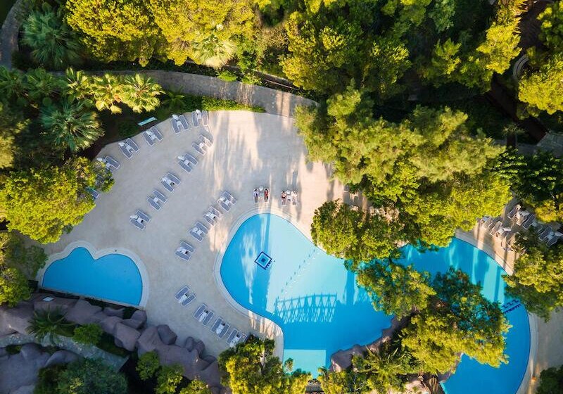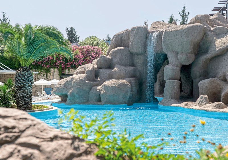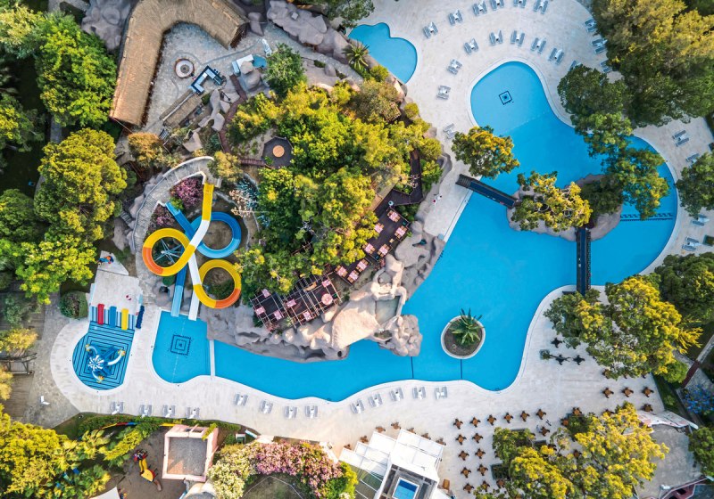 Die Anlage strukturiert Wege und Plätze klar: Empfangshalle mit Rezeption, Lobbybereiche und Shops gehen in Gärten und Sonnenterrassen über. WLAN steht in den öffentlichen Bereichen und auf den Zimmern zur Verfügung. Indoor schwimmt Ihr im Hallenbad mit Kinderbecken, draußen verteilen sich mehrere Pools mit Wasserrutschen und separaten Kinderpools.