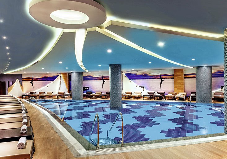 • Liegestühle • Hallenbad • Außenpool (saisonal) • Sonnenschirme • Pool • Poolbar • Sonnenterrasse • Badetücher • Wasserrutsche • Wasserpark