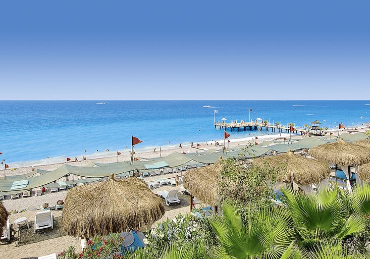 Ihr wohnt direkt am Strand, auf halber Strecke zwischen Alanya und Side. Beide Orte sind jeweils etwa 35 Kilometer entfernt, der Flughafen Antalya rund 90 Kilometer. Die Hauptstraße verläuft in der Nähe, Minibusse verbinden Euch unkompliziert mit den Orten an der Küste. So kombiniert Ihr erholsame Strandphasen mit Abstechern zu Promenaden, Basaren und Hafenbildern der Region.