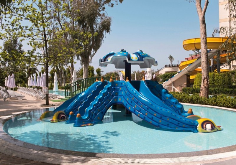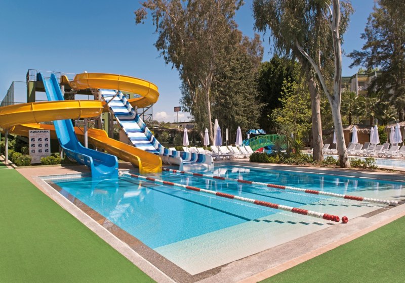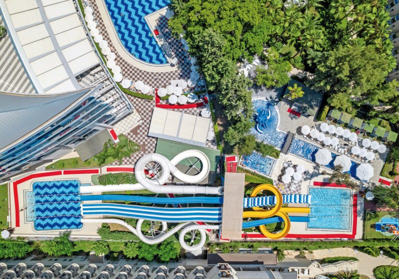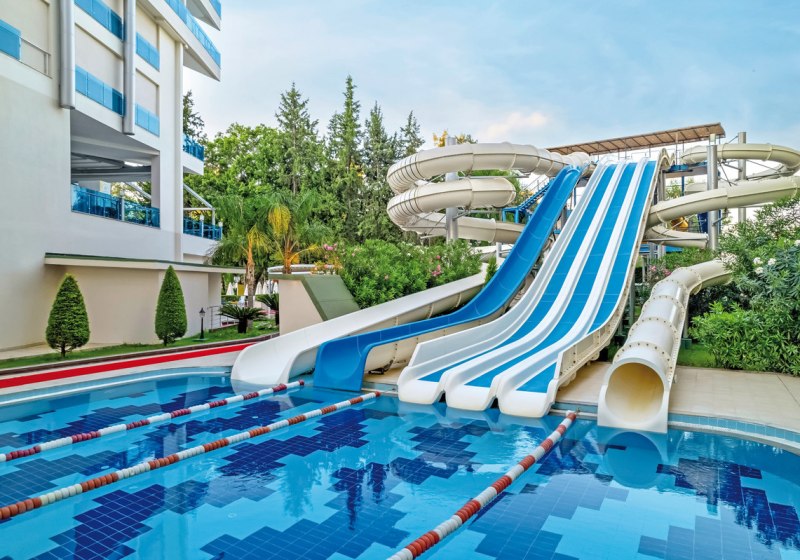 - Rutschenpools: Mehrere Süßwasserpools mit Wasserrutschen strukturieren den Badetag.