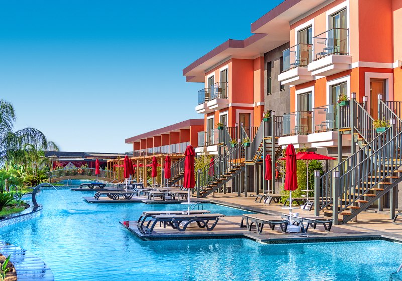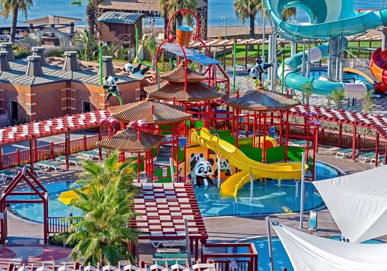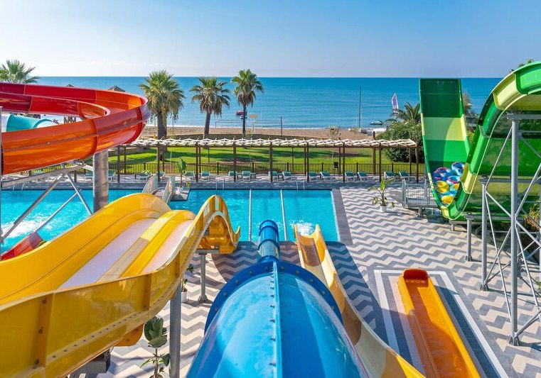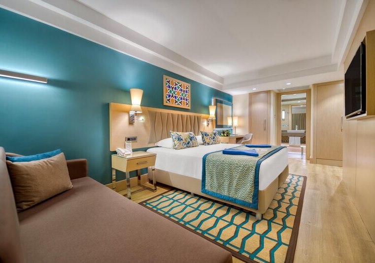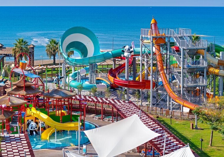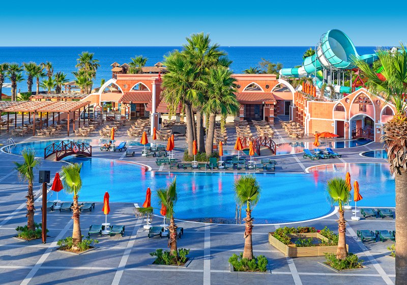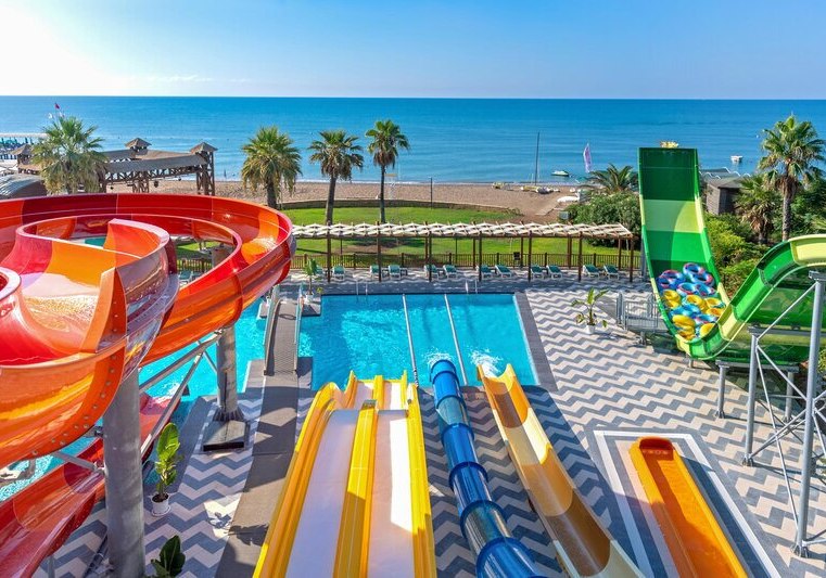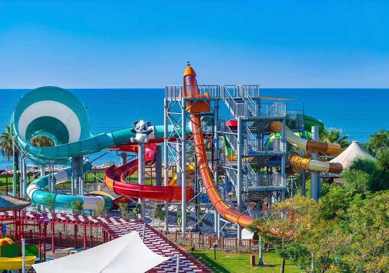 Im Außenbereich warten fünf Süßwasserpools, darunter Relax-, Aktivitäts- und Turkuazpool. Dazu kommt ein Hallenbad. Am Pool und am Strand nutzt Ihr Liegen, Schirme und Badetücher. Der Aquapark mit sieben Rutschen sowie separate Kinderbecken – innen und mit Rutschen – strukturieren Familientage effizient und übersichtlich.