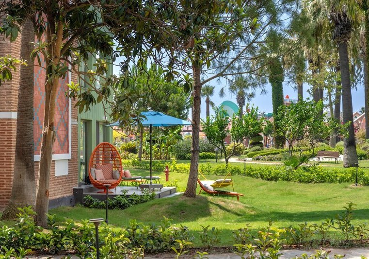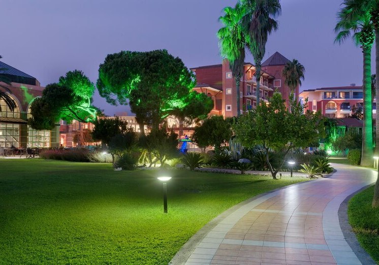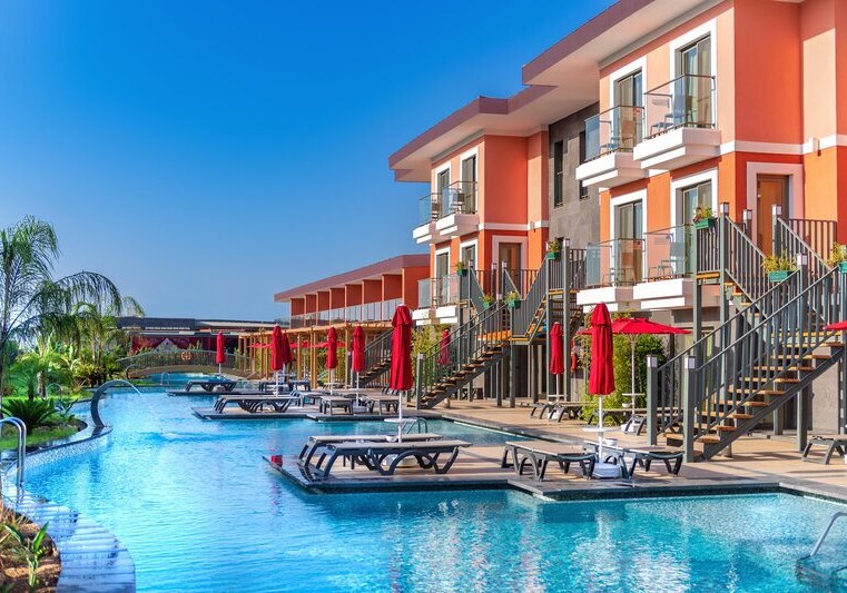 - Große Anlage: 130.000 Quadratmeter mit Gärten, fünf Außenpools und Hallenbad.