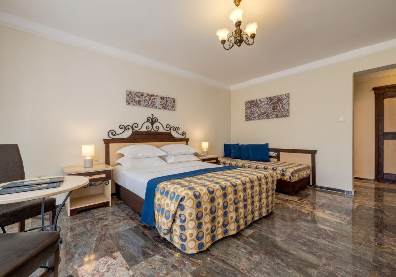Familien wählen Zimmer mit separatem Schlafzimmer oder Bungalow-Familienzimmer mit zwei Schlafzimmern und einem Bad. Zustell- und Kinderbetten sind möglich. Die Klimatisierung ist teils zentral, im Nebengebäude individuell regelbar. Highlight: Familiengrundrisse mit klarer Trennung für ruhige Nächte.