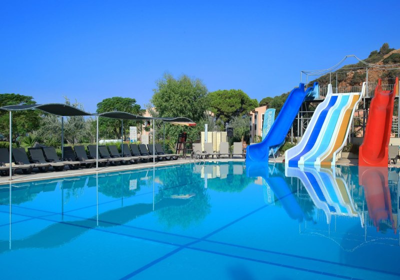 Familien profitieren von Kinderbecken, Kindermenüs und funktionalen Familienzimmern; Aktivferienende von einem breiten Sport- und Wassersportangebot. Der benachbarte Yali Castle Aquapark erweitert die Auswahl, das Zentrum von Gümüldür liegt nur etwa 3 km entfernt.
