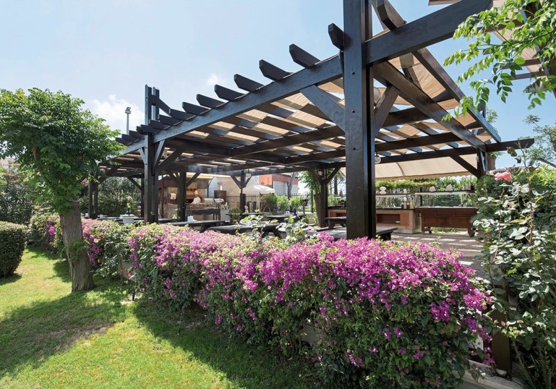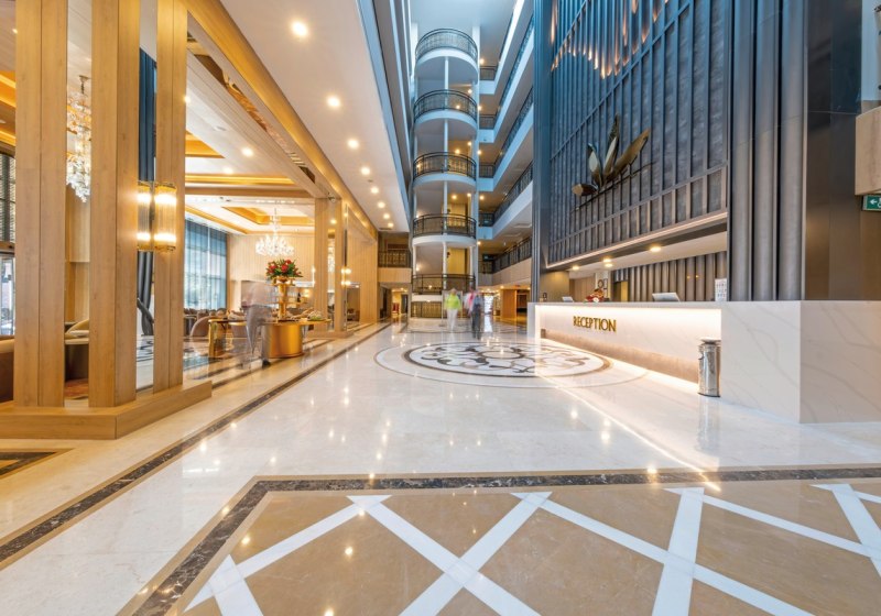 Das Resort gliedert sich in drei Gebäudeteile mit fünf Etagen und drei Liften. In der Empfangshalle mit Rezeption nutzt Ihr WLAN inklusive. Garten, Sonnenterrassen und Liegewiesen schaffen Luft zwischen den Bereichen. Geschäfte, Minimarkt und Souvenirshop liegen praktisch im Ensemble, ebenso Friseur, Patisserie und ein Internetcafé.