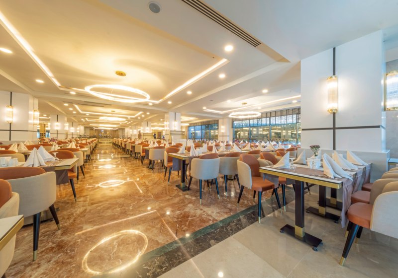 Aydinbey King's Palace & Spa verbindet ruhige Strandlage an der Promenade, 2025 renovierte Bereiche und eine große Poollandschaft mit Aquapark. All-Inclusive bis All-Inclusive Plus, À-la-carte-Optionen und spezifizierte Kostformen strukturieren Eure Tage genauso wie Miniclub, Mini-Disco und die hauseigene Disco.