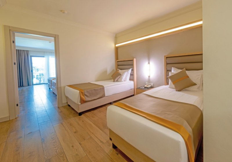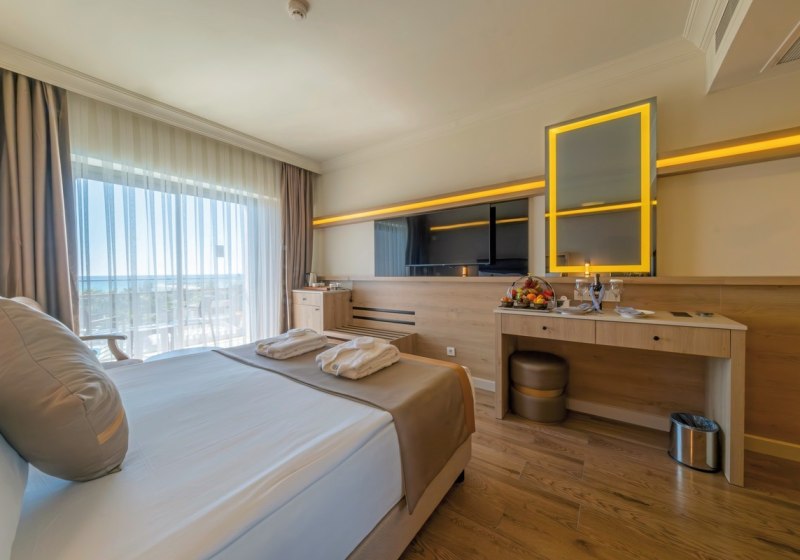 Ihr residiert durch die Strandpromenade vom flach abfallenden Sandstrand getrennt – nah genug für den spontanen Sprung ins Wasser, eigenständig genug für ruhige Stunden im Resort. Der historische Ortskern von Side liegt etwa 10 Kilometer entfernt. Bis zum Flughafen Antalya sind es rund 60 Kilometer. Vor dem Hotel warten öffentliche Minibusse und Taxis, die Euch flexibel zu Ausflügen bringen.