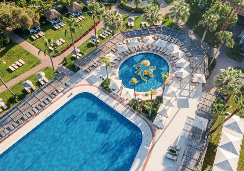 Im Außenbereich verteilen sich mehrere Pools, eine großzügige Sonnenterrasse und ein Wasserpark mit Rutschen. Liegen, Sonnenschirme und Badetücher sind an Pool und Strand vorgesehen. Spielplatz und Mini-Zoo setzen familienfreundliche Akzente, Swim-up- und Poolbar sorgen für kurze Wege. Zusatzservices von Wäscherei über Arzt bis Transferservice halten den Ablauf reibungslos.