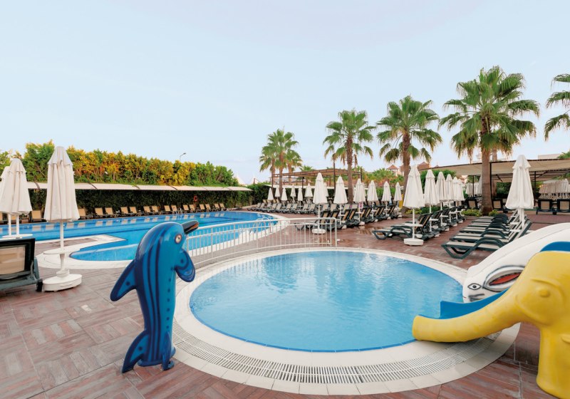 Drei Süßwasserpools, separater Kinderbereich, Relaxpool und ein Aquapark mit Wasserrutschen prägen das Outdoor-Leben. Auf der Sonnenterrasse stehen Liegen, Sonnenschirme und Badetücher bereit – am Pool ebenso wie am Strand. Der hoteleigene Shuttle schließt die 300 Meter Stranddistanz effizient. Spielplatz, Tischtennis, Minigolf, Darts, Beachvolleyball, Billard und ein Fitnessraum runden die Infrastruktur ab. Highlight: Klare Struktur – Lifts, Gartenwege, Shuttle und vielfältige Poolzonen.