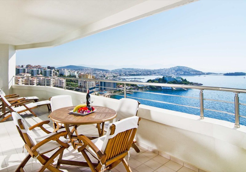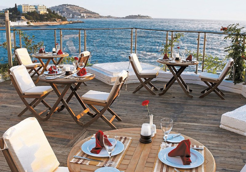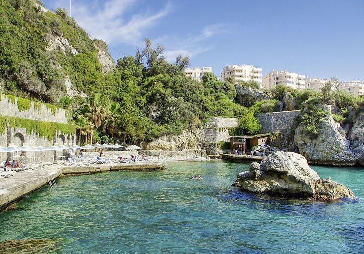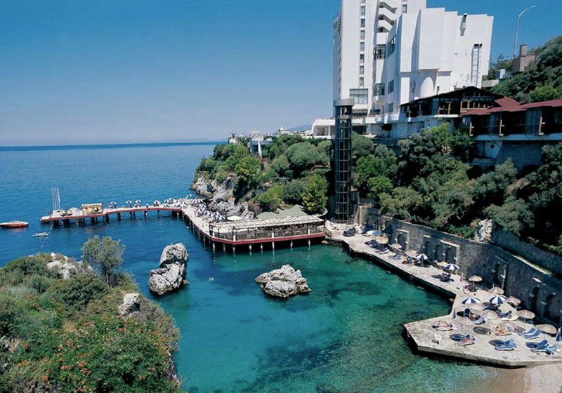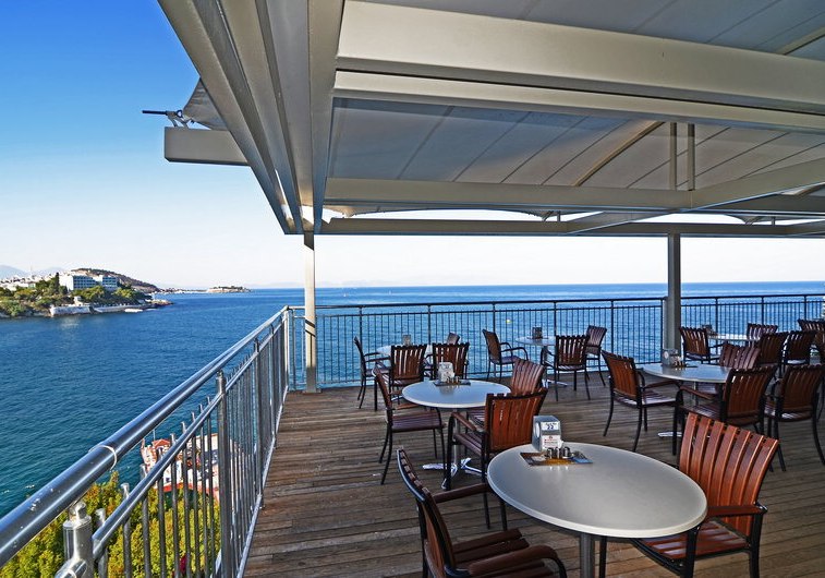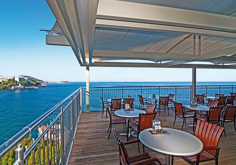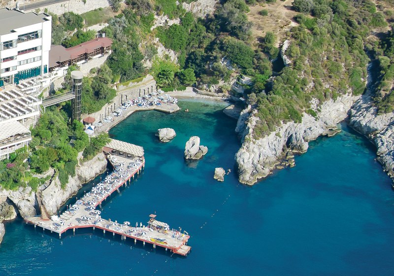 Ihr wohnt in Kusadasi‑Akyarlar, direkt an einer Bucht mit etwa 200 Metern Sand‑/Kiesstrand und zusätzlicher Badeplattform. Bis ins Zentrum von Kusadasi sind es rund zwei Kilometer; Minibus- und Taxi-Verbindungen warten unmittelbar vor dem Hotel. Der Jachthafen Kusadasi Marina liegt in ähnlicher Distanz; Bars und Clubs erreicht Ihr nach kurzer Fahrt oder einem längeren Spaziergang.