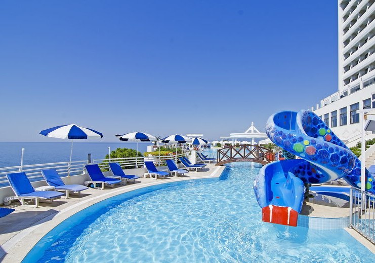 Die Badeplattform ist über Treppen und Lift erreichbar; an Pool und Strand liegen Liegen und Schirme bereit. Praktisch: Minibus- und Taxi-Stop direkt vor der Tür. Zusätzliche Ruhezonen finden sich in Lounge und Bibliothek. Für Familien: integriertes Kinderbecken und eine kleine Rutsche für Kleinkinder. Highlight: Strand- und Poolkomfort mit inkludierten Tüchern, Liegen und Schirmen.