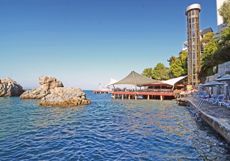 Im Korumar Hotel De Luxe wohnt Ihr in einem Haus mit klassischem Haupthaus-Charakter, acht Etagen und großzügiger Empfangshalle. Die Stimmung wirkt entspannt und zugleich strukturiert: kurze Wege, klare Bereiche, viel Platz zum Durchatmen. Der Blick geht auf eine geschützte Bucht mit kleinem Sand-/Kiesabschnitt und Badeplattform – Liegen, Schirme und Badetücher sind an Pool und Strand inklusive. Familien fühlen sich dank Kinderbereich am Pool und ruhiger Softanimation ebenso wohl wie Paare, die das Meer nah und die Stadt in Reichweite schätzen.
