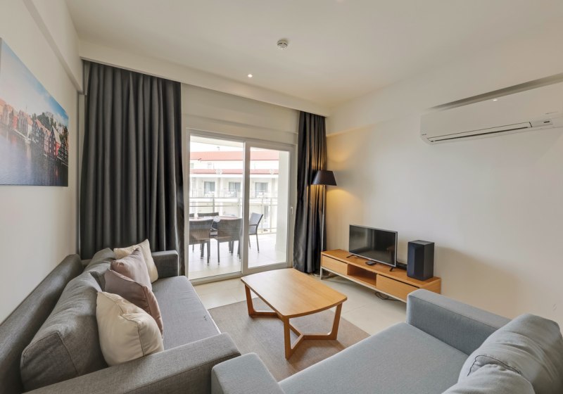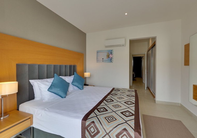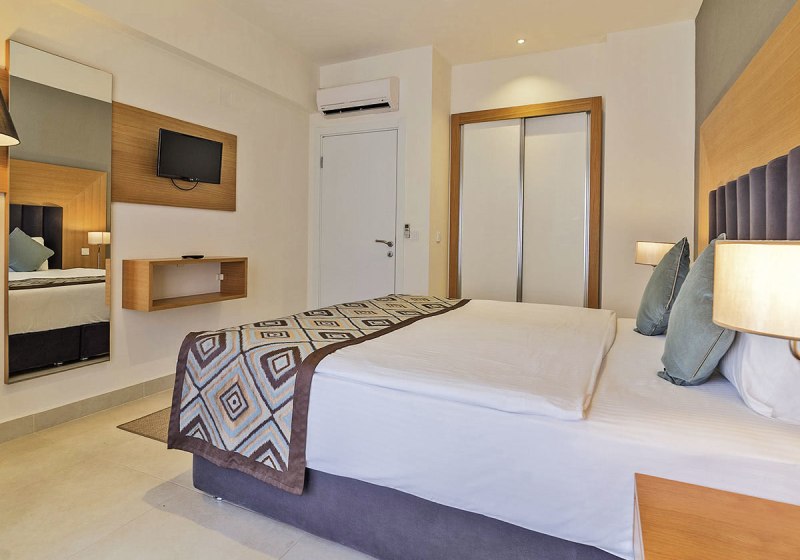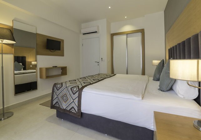 Ihr wählt zwischen Zimmern mit Balkon und seitlichem Meerblick sowie Suiten für mehr Raum. Die Zimmer bieten Klimaanlage, WLAN, TV und Telefon; Safe und Minibar stehen gegen Gebühr bereit. Ein Föhn liegt parat. Die Geräuschkulisse bleibt dank Schallisolation angenehm, der Balkon öffnet den Blick seitlich aufs Meer.