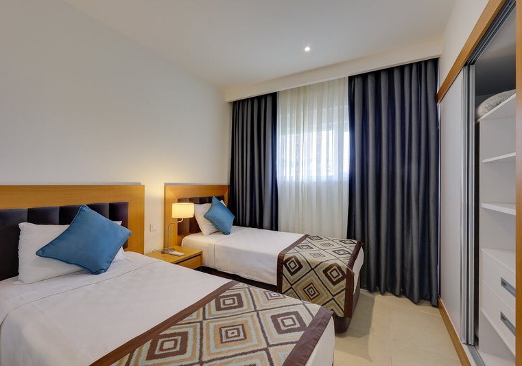 Die Infrastruktur wirkt durchdacht: 24-Stunden-Rezeption, acht Aufzüge, kostenloses WLAN, Shops und Minimarkt für das Nötige zwischendurch. Wer mehr Zeit in den Ferien am Wasser plant, nimmt Liegen und Schirme am Strand kostenfrei in Anspruch, Kinder toben im Wasserpark oder im separaten Pool. Kulinarisch bleibt Ihr flexibel mit All-Inclusive-Optionen, Snacks und Kindermenüs. Highlight: Privater Strand mit Shuttle, klar organisiert und mit inkludierten Liegen und Schirmen.