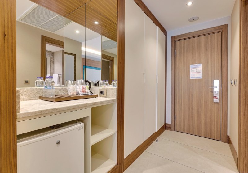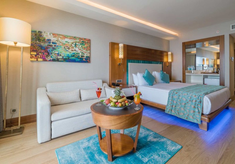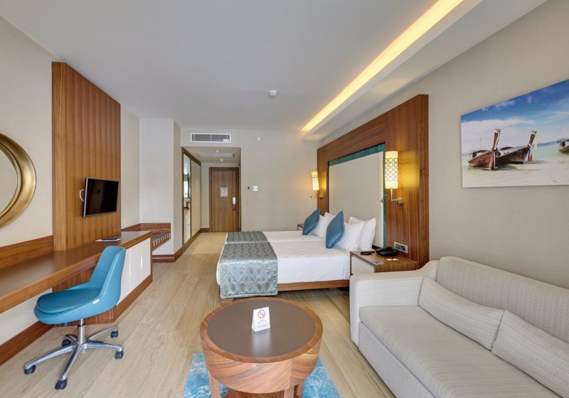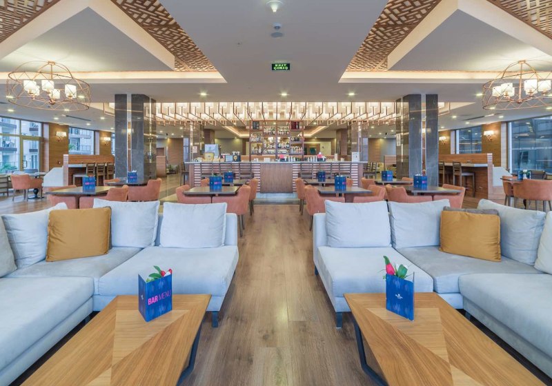 Im Ramada Resort by Wyndham Kusadasi wohnt Ihr in einem 5-Sterne-Resort, das Eure Tage strukturiert und leicht macht: morgens ein schneller Kaffee in der Lobbybar, später ein Sprung in den Pool oder hinunter per Shuttle an den privaten Sand-/Kiesstrand. Die Anlage ist so angelegt, dass Ihr zwischen Aktivität und Ruhe elegant wechselt – mit großzügigen Außenbereichen, einer Sonnenterrasse und Rückzugsorten wie Bibliothek oder TV-Raum. Familien finden klare Angebote für verschiedene Altersgruppen, während Paare die langen Abende zwischen Bars und Theatersaal genießen.