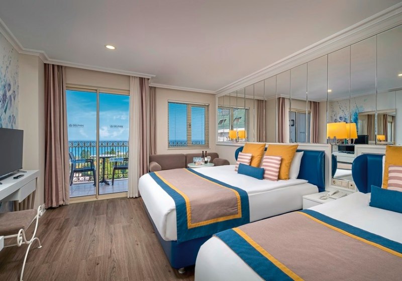 Im Delphin Diva wohnt Ihr direkt am hoteleigenen Sandstrand von Lara, dessen Flutsaum kieselig schimmert. Das Haus setzt auf großzügige Außenflächen und ein lebendiges Programm, das Euch vom Morgen bis in die Nacht begleitet. Die große Süßwasser-Poollandschaft mit acht Wasserrutschen, Gartenbereichen und vielen schattigen Plätzen bildet den Mittelpunkt. Familien finden Miniclub, Kinderpool und Lunapark, während Paare die Abende im Amphitheater, bei Live-Musik oder in der Disco ausklingen lassen.